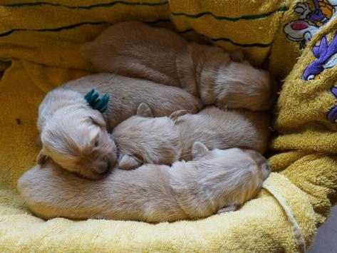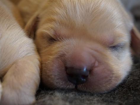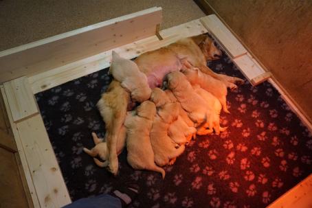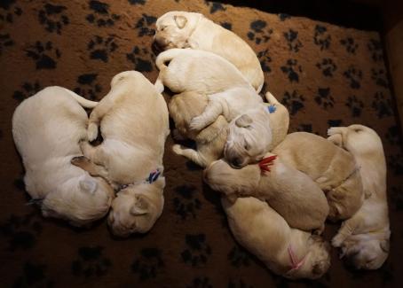 Unser I-Wurf entwickelt sich weiterhin prächtig und Cessy´s Körpertemperatur pendelt sich auch schon langsam wieder fast im Normalbereich ein. (Normaltemperatur Hund liegt bei 37,5 - 38,0 °Celsius - eine Woche nach der Geburt ist die Körpertemperatur erhöht - bis zu 39,5 ° sind noch ok). Unsere I-Wurf Rüden haben alle nach sieben Tagen ihr Gewicht schon verdoppelt und bei den Hündinnen fehlt auch nicht mehr viel. Das ist ein echter Rekord! Ansonsten passiert natürlich noch nicht allzu viel in der Kiste, da es sich die ersten zwei Lebens Wochen unserer I´s in erster Linie nur ums "Gewicht zunehmen" dreht. Das heißt im zwei Stunden Rhythmus wird genuckelt und dann gleich wieder geschlafen. Die Fortbewegung sieht für einen Hund auch noch sehr unprofessionell aus und erinnert mehr an eine Robbe. Unsere Welpen sind ja nach wie vor blind und taub - einzig der Geruch- und Tast-Sinn ist schon seit der Geburt voll einsatzfähig. Ab dem 10. Lebenstag werden sich langsam Gehörgang und Augen öffnen. Es wird dann aber immer noch einige Tage dauern bis sie scharf sehen und gut hören können. So ab dem 14. Lebenstag werden sie sich langsam aufrichten und die ersten richtigen Gehversuche werden dann gemacht (ohne dass der Bauch am Boden rutscht :-))