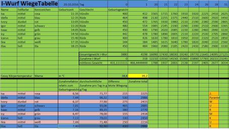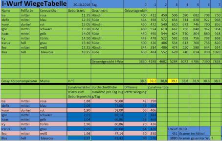 "Ilea" bei den Hündinnen und "Isaac" bei den Rüden führen derzeit die Zunahme Tabelle an. Ilea hat ihren Nachteil den sie mit ihren 344g bei Geburt hatte schon fast weggenuckelt!