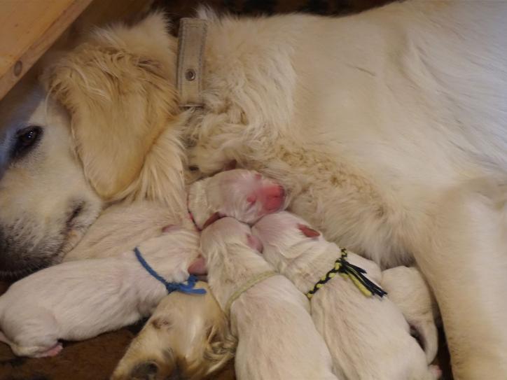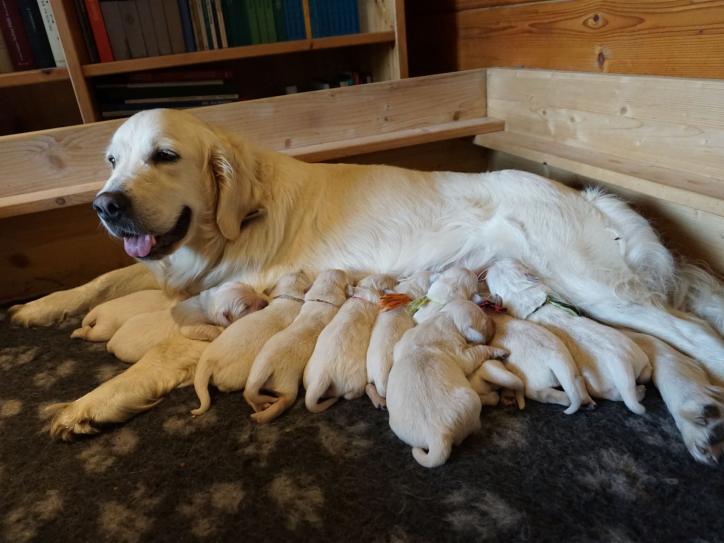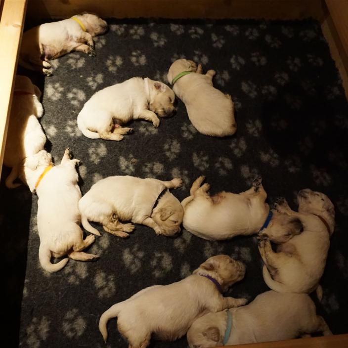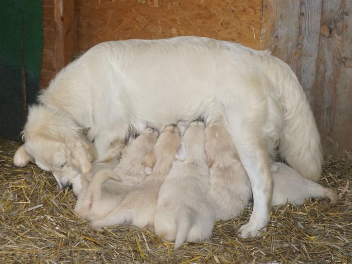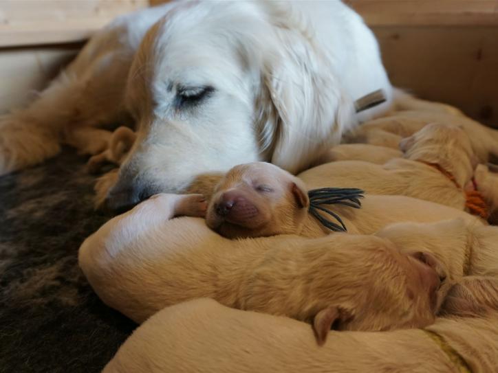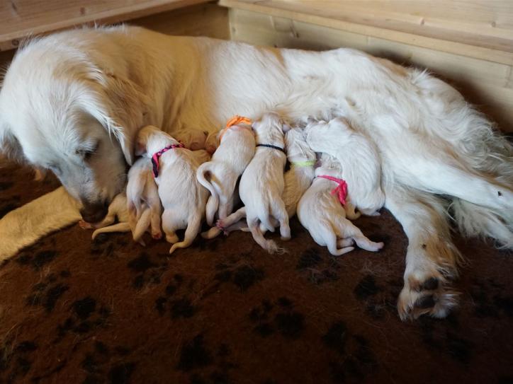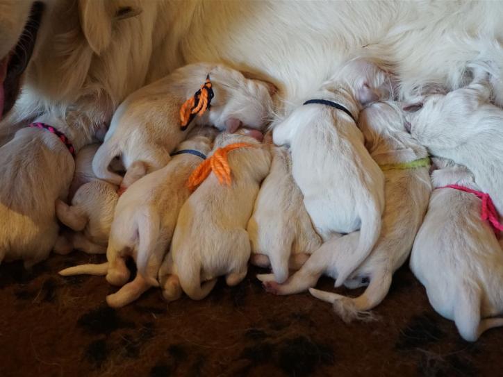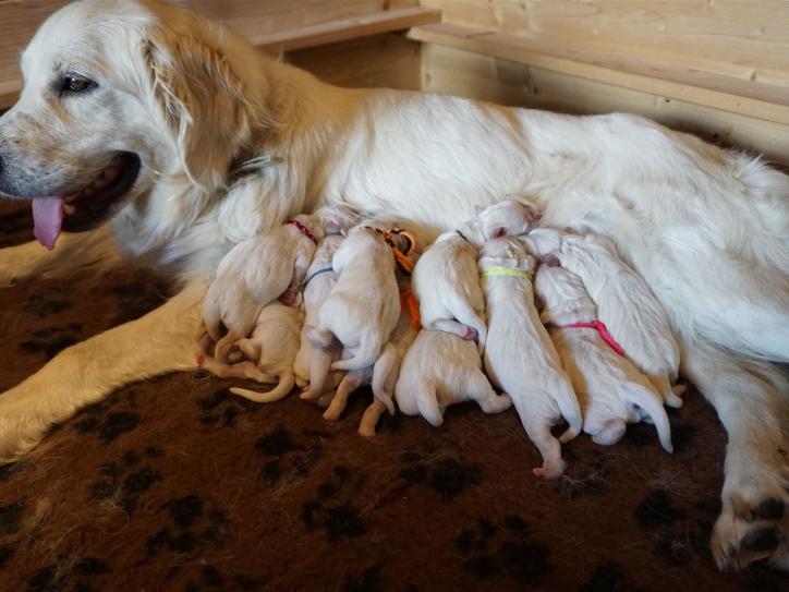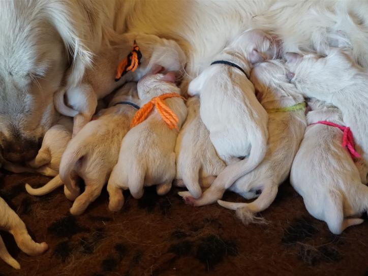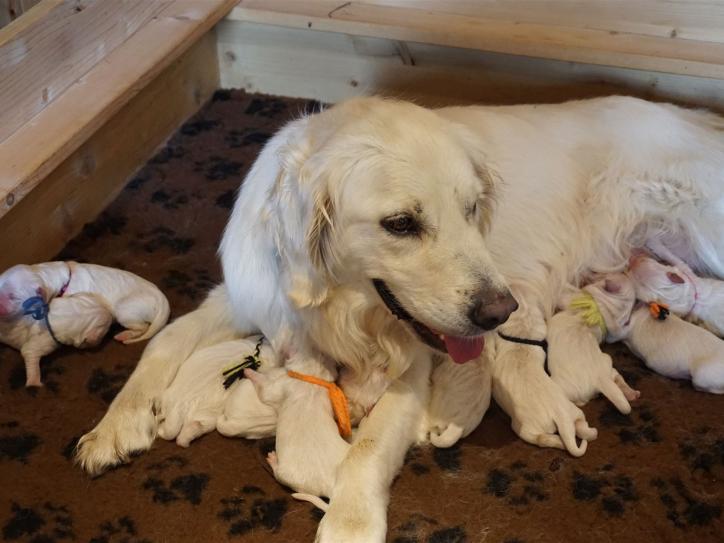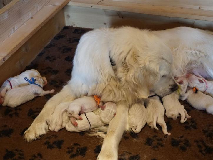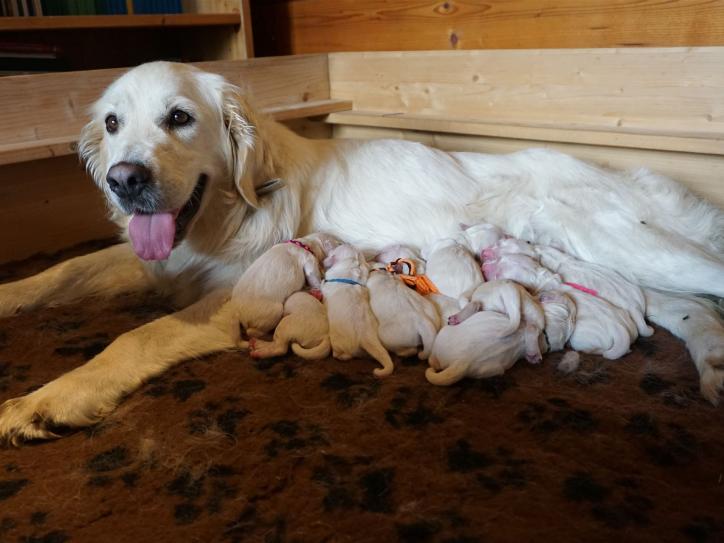 Am 10.07.2017 hat unsere Grace in einer unproblematischen Geburt 10 wunderschöne Welpen zur Welt gebracht. Es sind 7Rüden und 3 Hündinnen in den Farben creme und hellgolden.