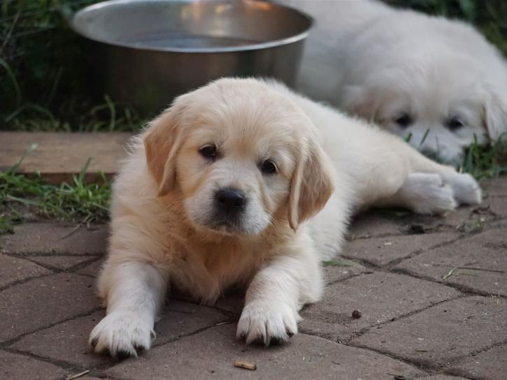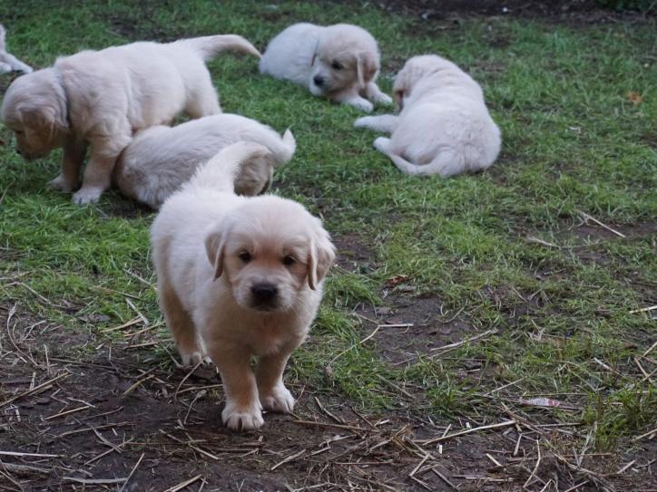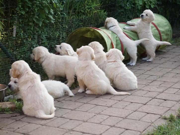....mit knapp 7 Wochen sind unsere J´s voll aktiv und strotzen nur so vor Lebensfreude. Jeder unserer 10 kleinen Goldilein ist zu einem gesunden Hund herangewachsen .... es ist eine Freude der Rasselbande beim Spiel zuzusehen. Mittlerweile sind sie groß genug und dürfen ihrem Bewegungsdrang auch auf der großen Wiese freien Lauf lassen.